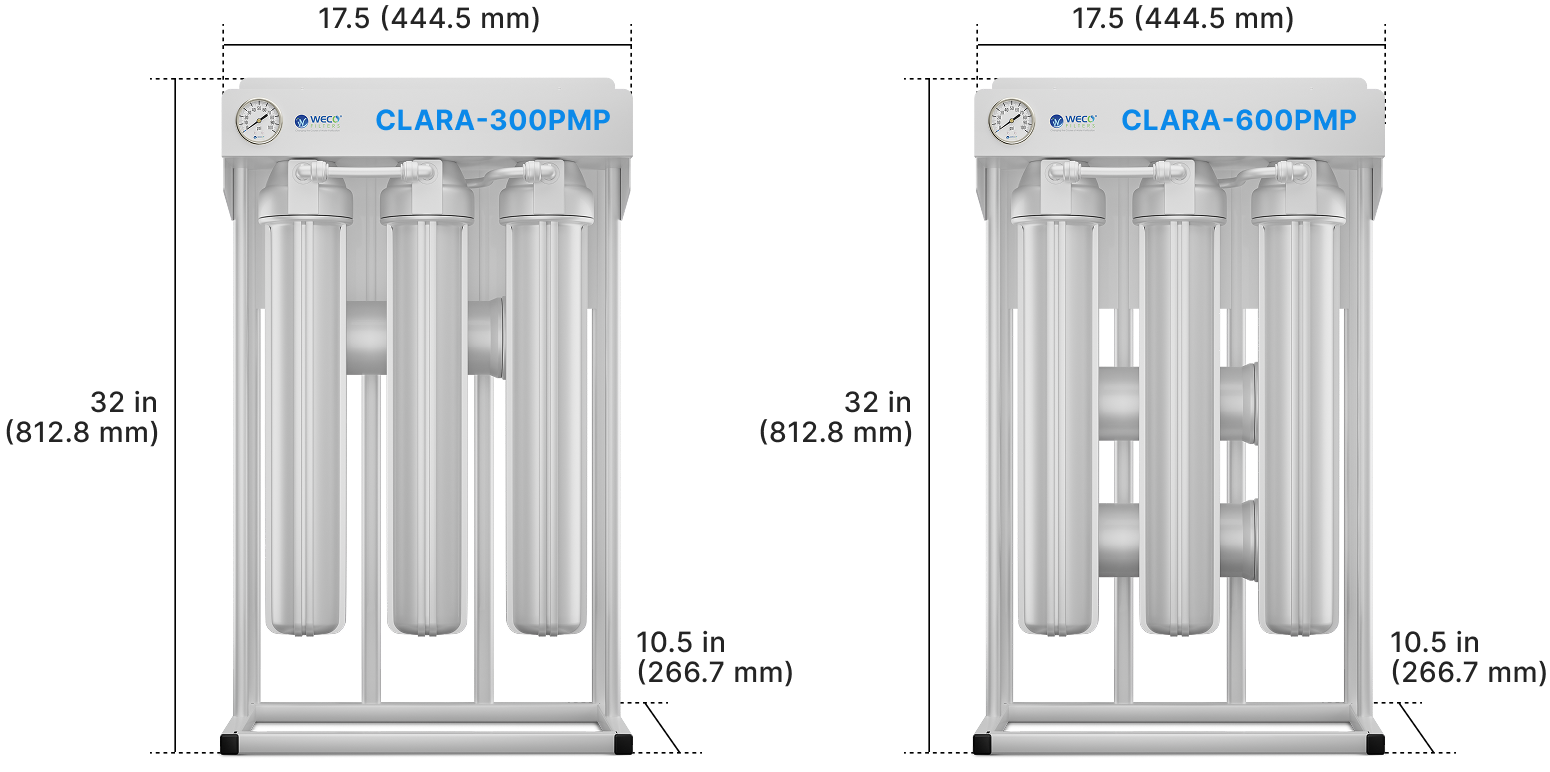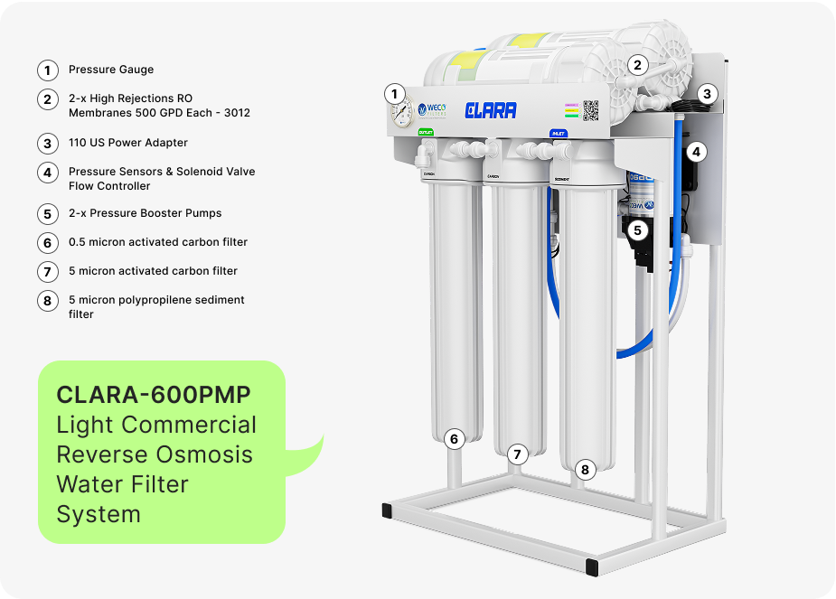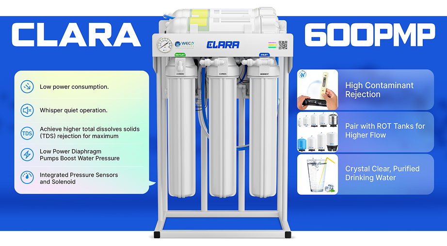 WECO CLARA series light commercial reverse osmosis system filters your drinking water, rejecting unwanted contaminants like lead, sodium, mercury, nitrate, chlorine, chloramine, chromium, tds and more. Filtered water is ideal for kitchen, whole house reverse osmosis, medical offices, laboratories, schools, aquariums and hydroponic growing operations. The CLARA filtration process starts by removing tiny particles like rust, silt, and insect parts. This protects your family and prevents the filtration systems from clogging. Next, the water flows through two activated carbon block cartridges. These compressed carbon block filters remove taste and odor-causing chemicals like chlorine, chloramine and rotten-egg odors. Chlorine disinfection process can create cancer-causing byproducts in the water. These carcinogens, called THMs, are removed by the carbon filters.