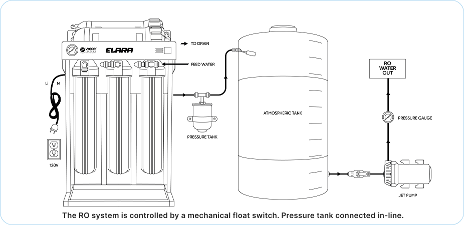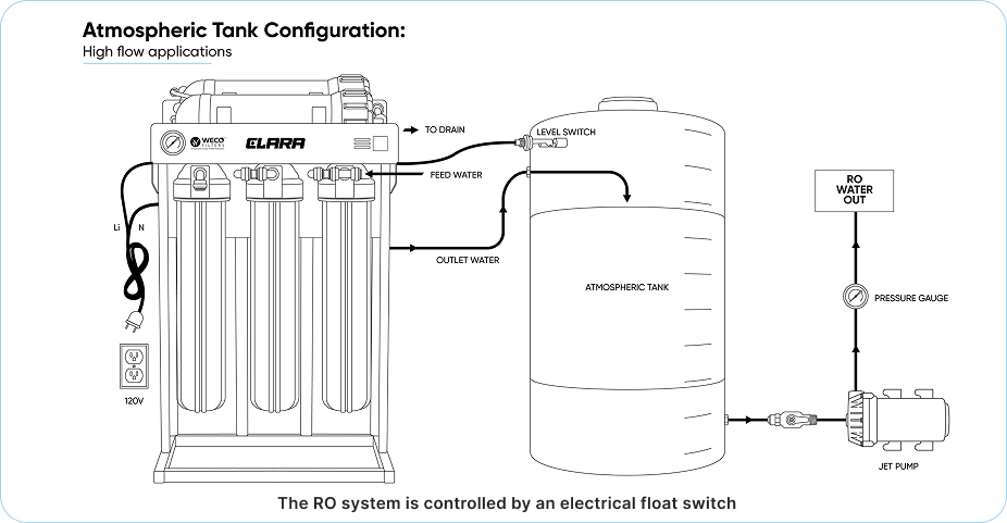 T-in pressurized water storage tanks provide higher drinking water flow. Larger tanks support longer high-flow periods. Pair with WECO ROT series tanks for automated pump control. Whole-house flow requires larger atmospheric tanks with delivery pumps, which need more space, maintenance, and professional setup.