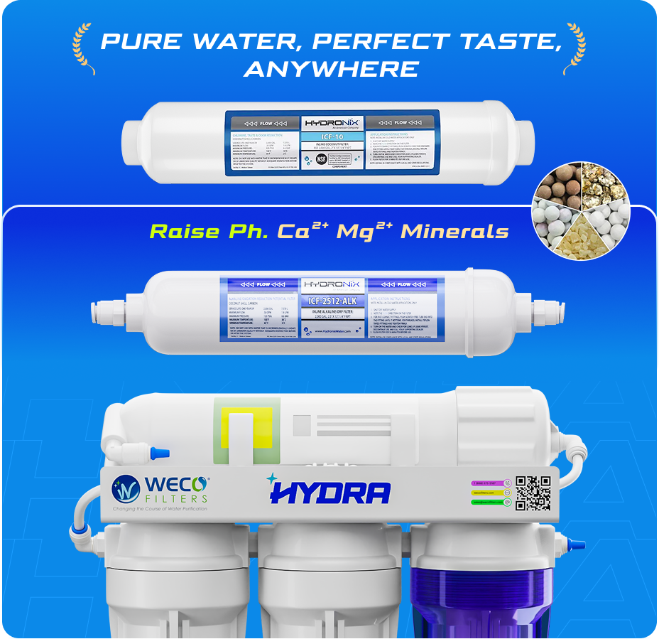 The WECO Hydra reverse osmosis system delivers clean, fresh-tasting water for homes, offices, gyms, juice bars, and coffee shops. It uses multiple filtration stages: