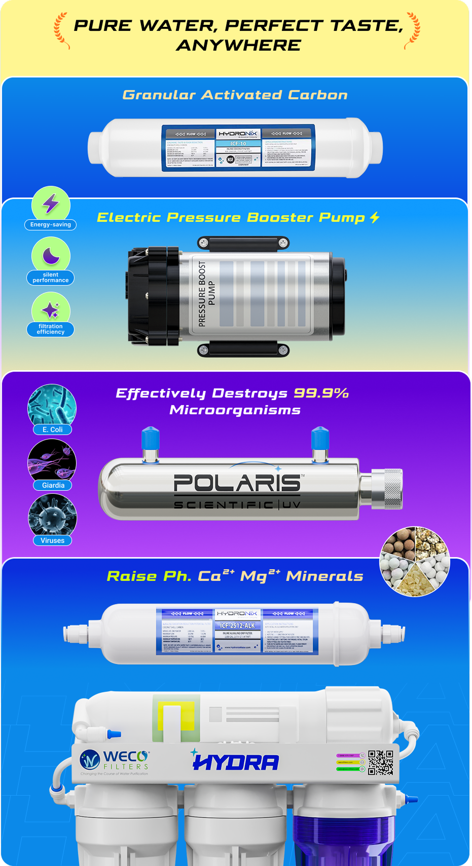 The WECO Hydra reverse osmosis system delivers clean, fresh-tasting water for homes, offices, gyms, juice bars, and coffee shops. It uses multiple filtration stages: