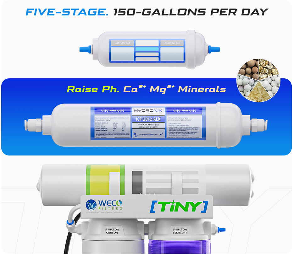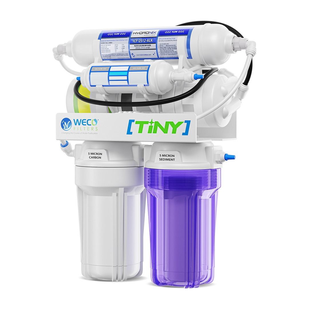 - Compact pre and post filter cartridges make this unit half the size of traditional RO filters.