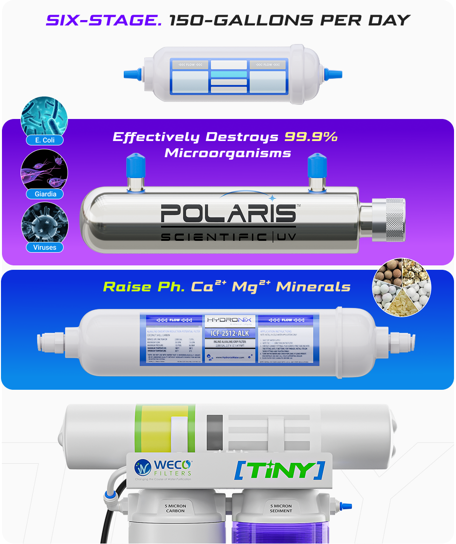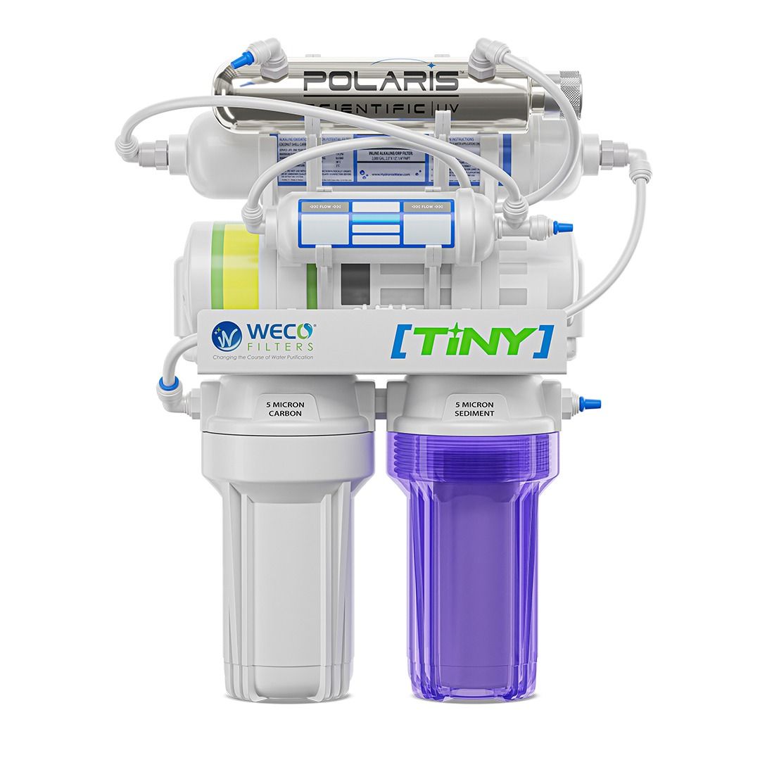 - Compact pre and post filter cartridges make this unit half the size of traditional RO filters.