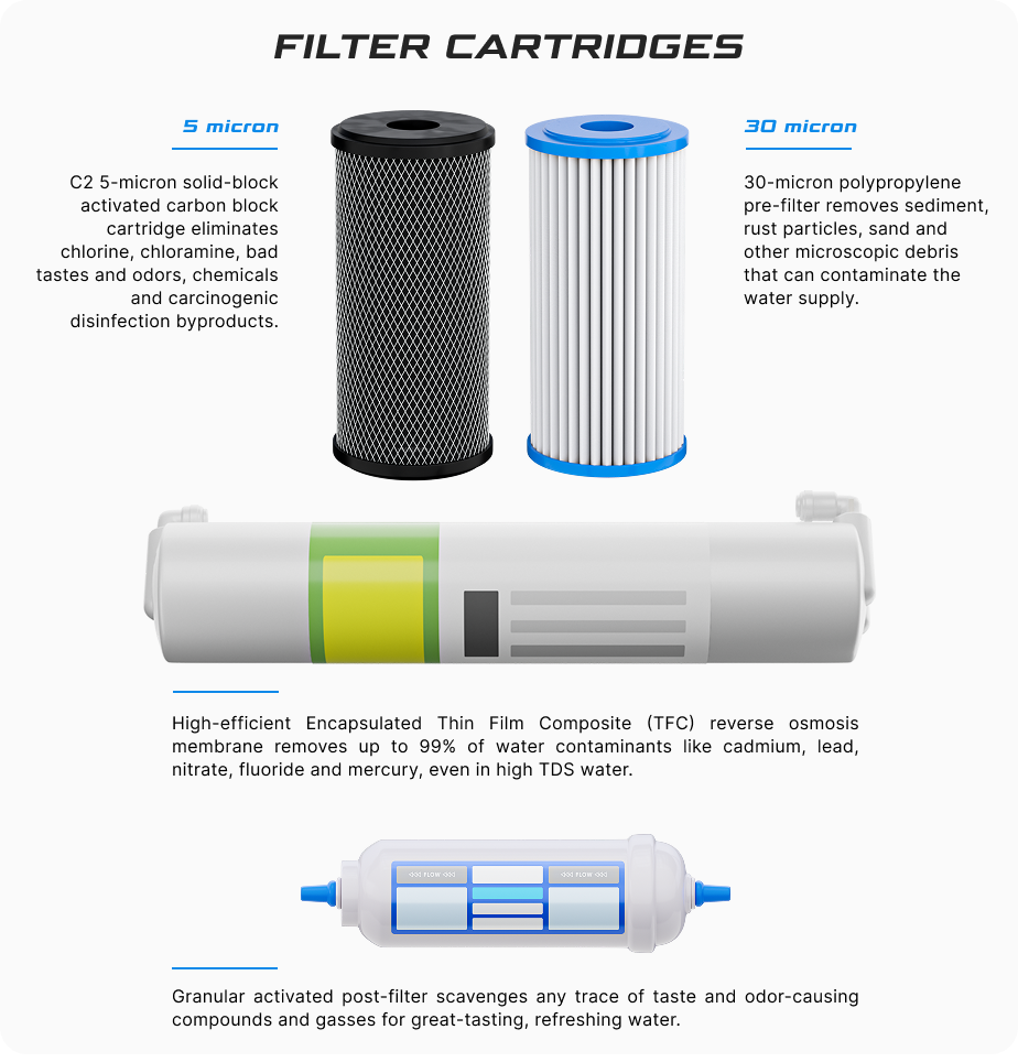 - Post-filter (Pentek GS-6RO GAC) polishes water, removing residual tastes and odors.