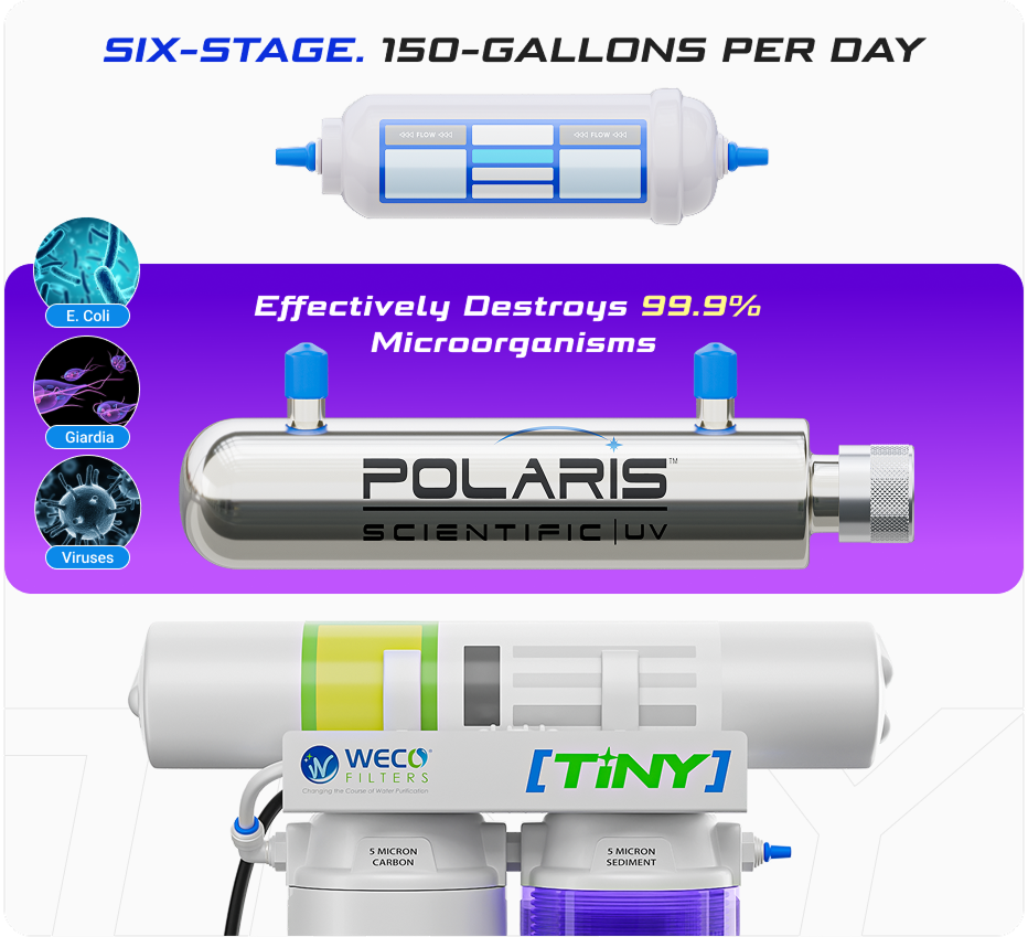 - Complete four-stage 150 gallons per day reverse osmosis water purification system with UV disinfection for home or office installations