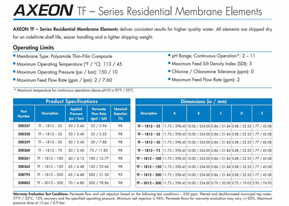 To help light commercial and tap water applications increase operational efficiency, AXEON Water Technologies has introduced the TF-3012-500 reverse osmosis membrane. This membrane produces 500 gallons per day with a 98% salt rejection rate at only 70 psi. Utilizing AXEON’s proprietary HF5 Technology™, the TF-3012-500 membrane increases efficiency and provides a 40% recovery rate and 25% less waste than standard membrane elements. High active membrane area and the unique multi-leaf design provides a better system operation for the user. The membrane can also be retrofitted onto existing systems already in use in the field. The AXEON TF-3012-500 membrane is shipped 100% dry for convenient handling, and to maintain the integrity of the element’s performance. Meet your customer’s higher production rate demands while sending less water to the drain with the AXEON TF-3012-500 RO Membrane.