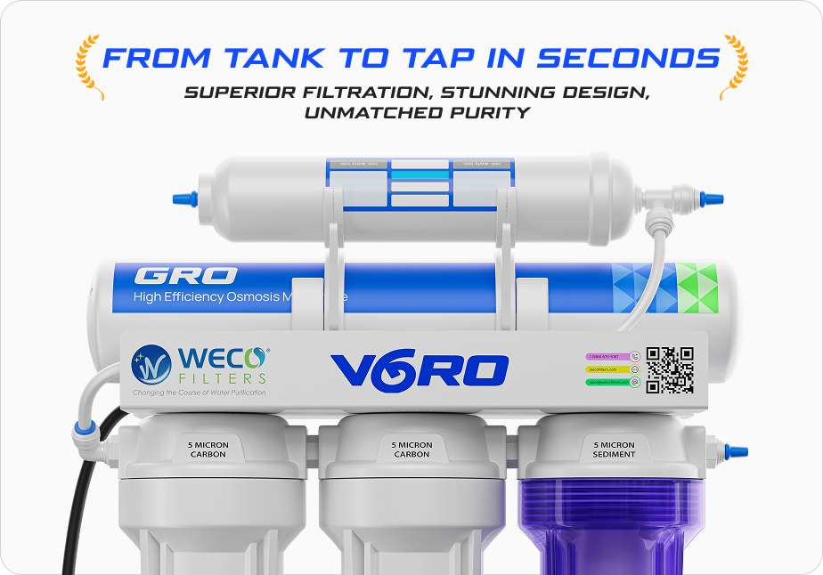 The WECO reverse osmosis filtration system also includes a pressurized water storage tank and a brushed nickel designer faucet for dispensing the purified water. WECO reverse osmosis systems use NSF-certified (Standard 61, Section 9) lead-free dispensing faucets. The faucets look attractive, fit into any decor and are certified lead-free to protect you, your family and pets. As the filtration system makes purified water, it fills the storage tank (up to 3 gallons at a time).