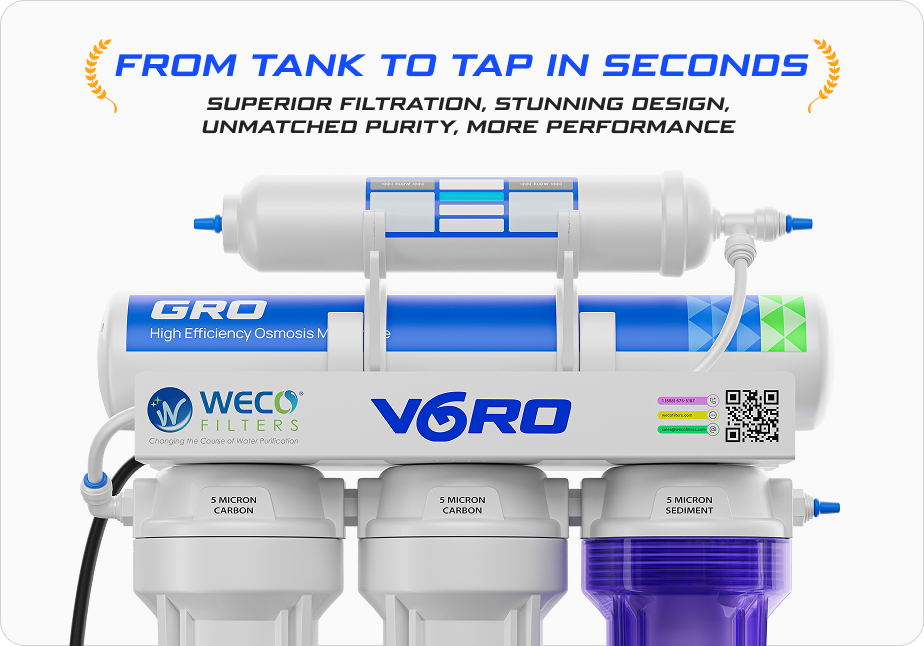 The WECO reverse osmosis filtration system also includes a pressurized water storage tank and a brushed nickel designer faucet for dispensing the purified water. WECO reverse osmosis systems use NSF-certified (Standard 61, Section 9) lead-free dispensing faucets. The faucets look attractive, fit into any decor and are certified lead-free to protect you, your family and pets. As the filtration system makes purified water, it fills the storage tank (up to 3 gallons at a time). The WECO VGRO reverse osmosis filtration system is the ideal water purification filter for home, office, health clubs, juice bars, coffee shops or anywhere safe, fresh-tasting water is needed. The WECO reverse osmosis system uses separate individual stages of water filtration to create pure, refreshing drinking water. The process starts by pre-filtering the water through a 5 micron sediment filter. Prefiltration removes tiny particles that can get into the water supply. These include iron oxide (rust), silt, sand grains and insect parts. This filtering stage protects your family from drinking sediment and prevents the filtration system from clogging.